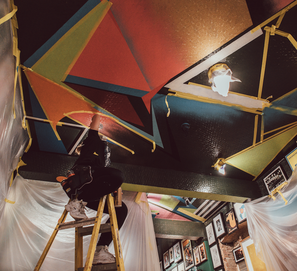 The Devonshire, a popular pub in the heart of Soho, London, is renowned for serving one of the best pints of Guinness in the city. At the centre of the pub is the Green Room — the heart of the space — a lively, artistic environment filled with energy, music, and creativity. I was commissioned to design and paint a custom mural that would capture this vibrant spirit and reflect the unique character of this space.